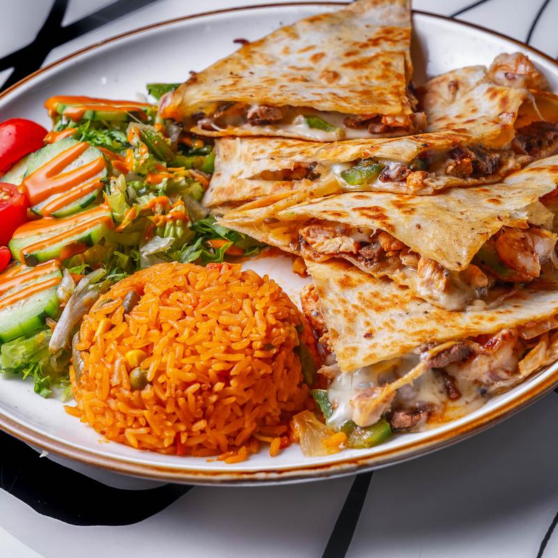 Chicken $18.20 | Steak $19.20 | Chorizo $19.20 • Quesadilla filled with protein choice and cheese. Served with salad and rice