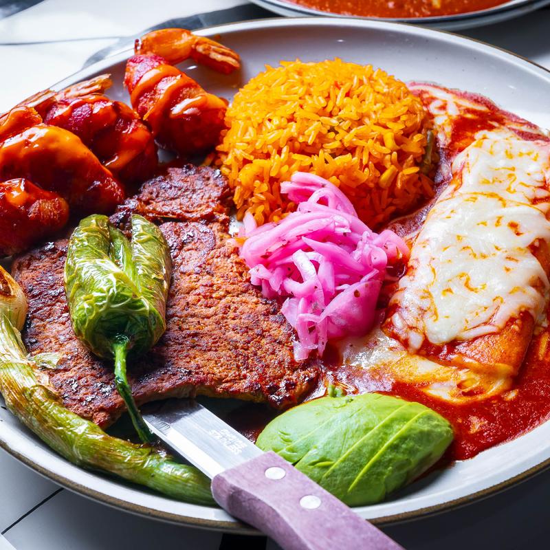 Chicken $19.20 | Shrimp $22.30 | Steak $20.25 • Quesadilla filled with your protein choice and melted cheese, served with rice and beans