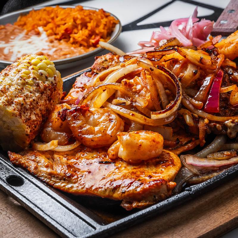 Steak, chicken, shrimp and chorizo. Topped with melted cheese