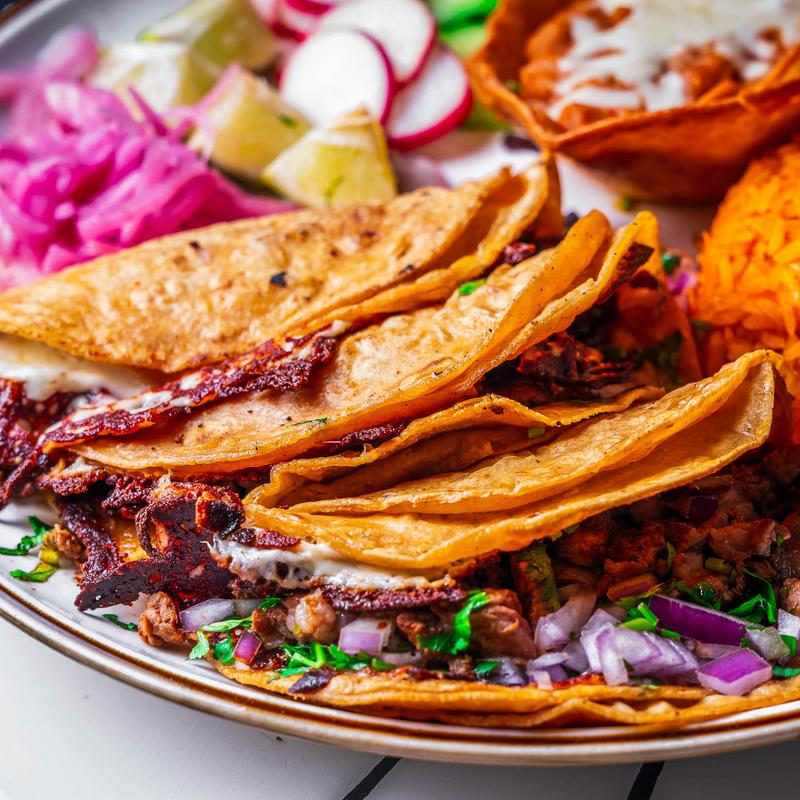 Steak | Grilled Chicken | Al Pastor • Three tacos with cheese crust, filled with pico de gallo, sour cream, special sauce and your protein choice